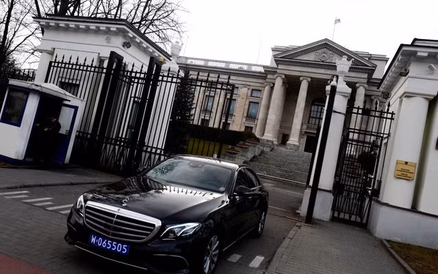 Một chiếc ô tô đi qua cổng tòa đại sứ quán Nga ở Warsaw, Ba Lan vào 26/3/2018.