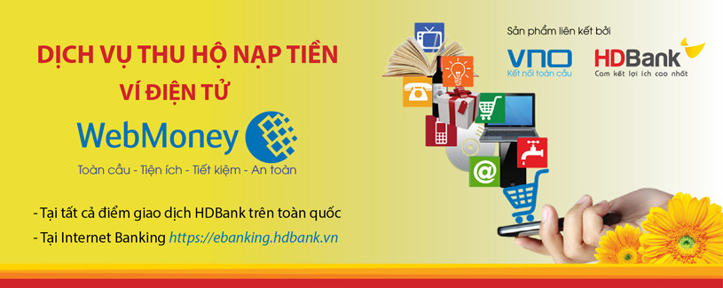 Theo đó, khách hàng của WebMoney có thể thực hiện giao dịch nạp tiền vào Ví điện tử WebMoney Vietnam qua dịch vụ của HDBank, bằng hai cách: Nạp trực tiếp bằng tiền mặt VNĐ tại tất cả Điểm giao dịch HDBank trên toàn quốc và Nạp trực tuyến bằng chuyển khoản Internet Banking của HDBank tại website https://ebanking.hdbank.vn.