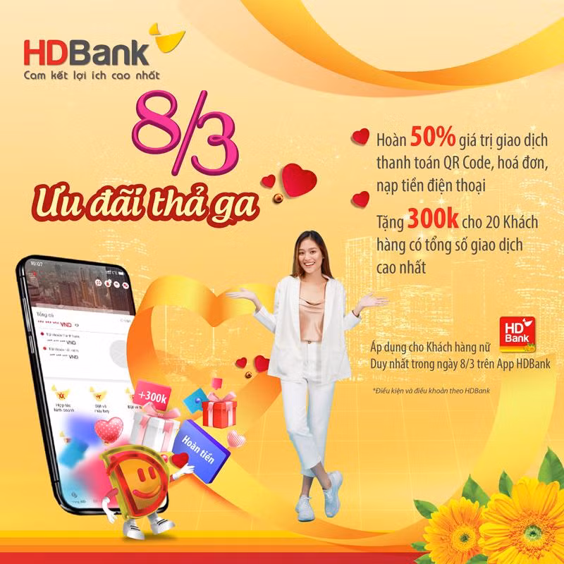 Duy nhất trong ngày 08/03, HDBank dành tặng 50% giá trị giao dịch (tối đa 50.000 đồng) cho 830 khách hàng nữ đầu tiên nạp tiền điện thoại, thanh toán hóa đơn sinh hoạt, thanh toán QR Code với giá trị tối thiểu 100.000 đồng trên App HDBank. Đặc biệt, 20 khách hàng phái đẹp có tổng doanh số giao dịch hợp lệ cao nhất sẽ được tặng 300.000 đồng.