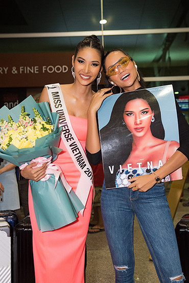 Gia đình của Hoàng Thùy bao gồm cha mẹ và em gái cũng đã có mặt từ rất sớm để tiễn cô. Trong thời khắc này, cả gia đình cô ai cũng đều thể hiện một cảm xúc đầy tự hào. Đặc biệt, Hoa hậu Hoàn vũ H’Hen Niê cũng có mặt ở sân bay để tiễn Hoàng Thuỳ.