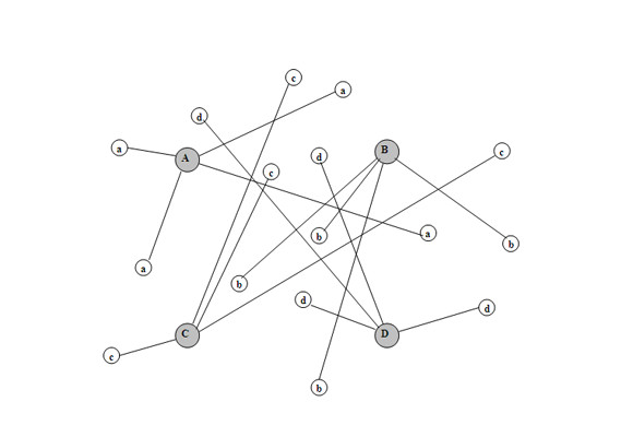 a, b, c, d: Nơi ở của các cán bộ công nhân viên, học sinh,… tương ứng với các cơ quan A, B, C, D phân bố ngẫu nhiên trên toàn thành phố.