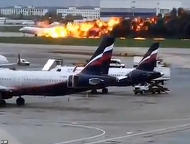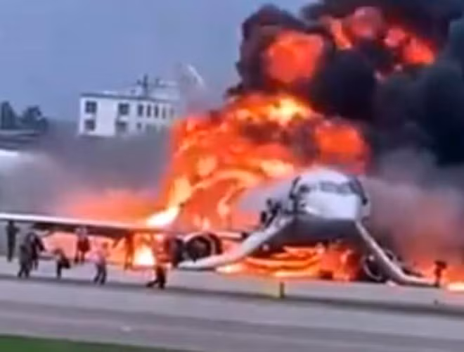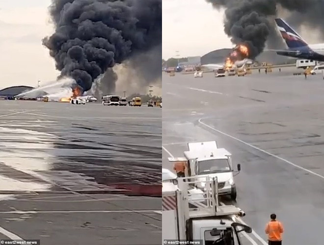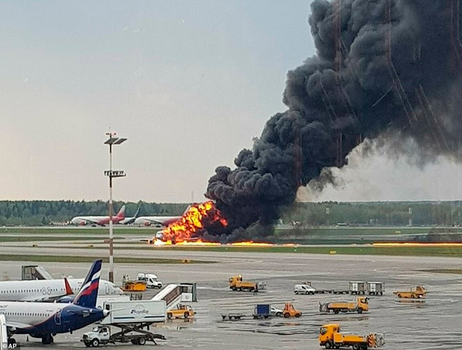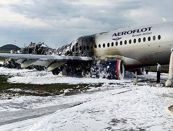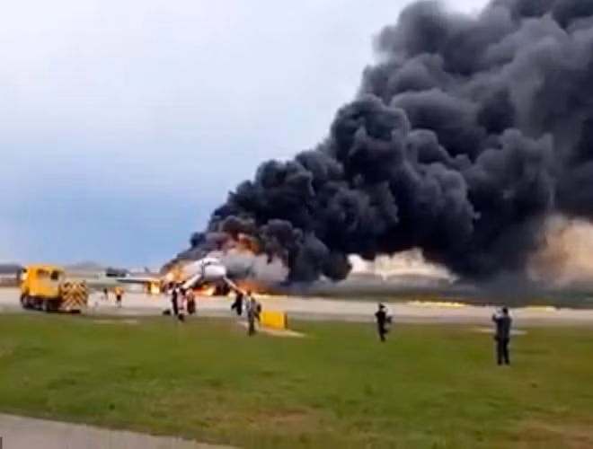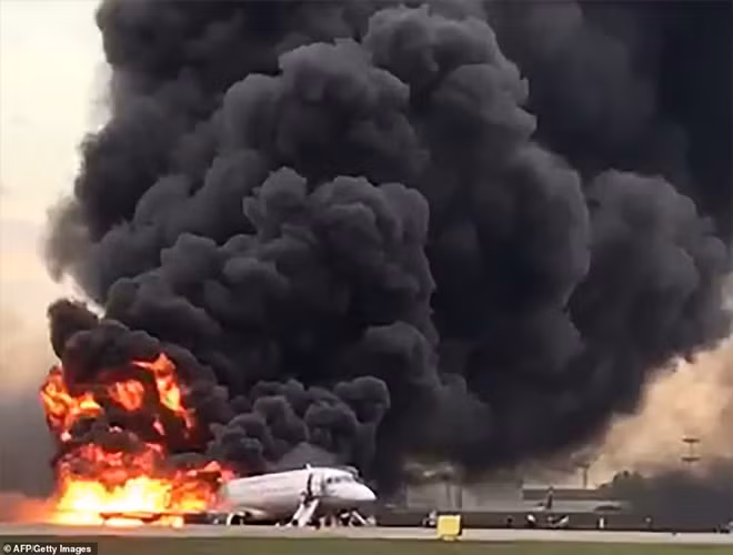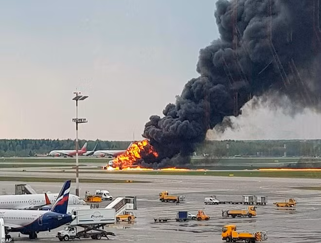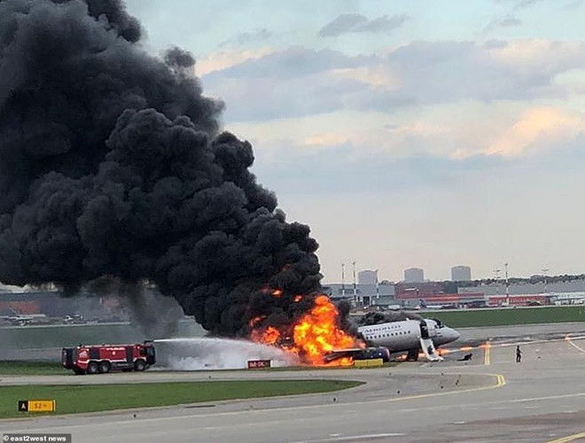 ANTD.VN - Cột khói khổng lồ bốc lên nghi ngút và đám cháy nhấn chìm chiếc máy bay Sukhoi Superjet SSJ-100 ngay khi nó vừa hạ cánh xuống sân bay Sheremetyevo, Moscow. Tại hiện trường, hành khách nhốn nháo sơ tán từ phần đầu máy bay, trong khi phần đuôi cháy đen bị hư hỏng hoàn toàn. Ít nhất 41 người thiệt mạng, trong đó có 2 trẻ em và 1 thành viên phi hành đoàn.