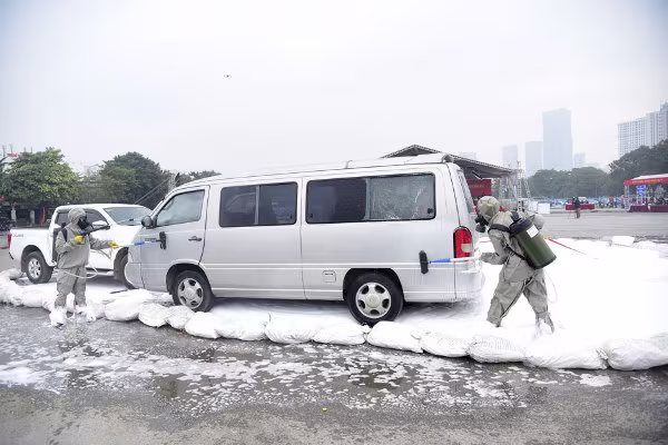 Lực lượng chức năng tổ chức phun các chất tẩy, khống chế sự lây lan của chất phóng xạ theo tình huống giả định