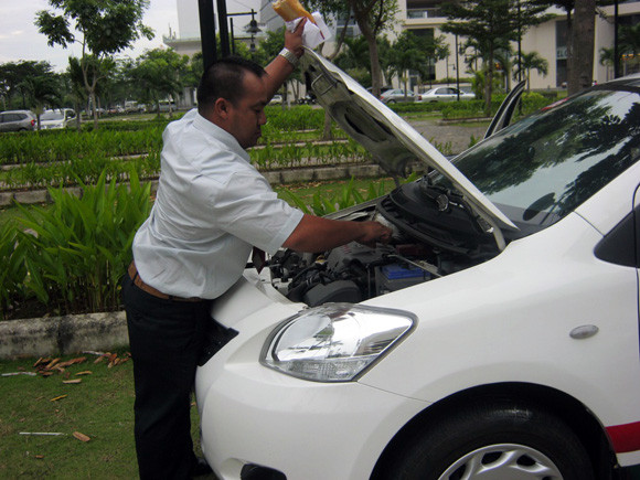 Chàng tài xế này rất cẩn thận, ngay cả lúc ăn cũng tranh thủ kiểm tra xe