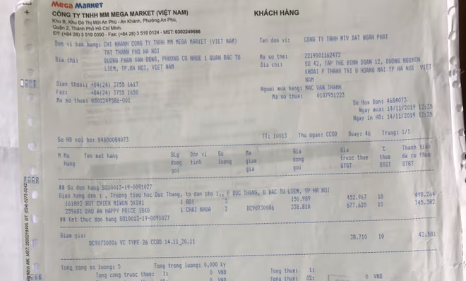Hoá đơn mua nguyên liệu nhập về bếp ăn trường Tiểu học Đức Thắng ngày 24-11