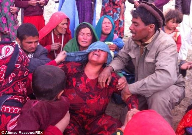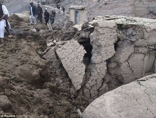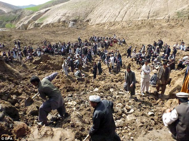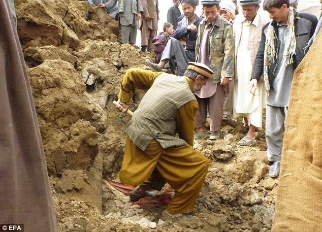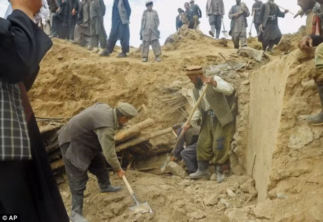 Dân làng nỗ lực đào bới đống đổ nát để tìm kiếm người thân. Ảnh AP