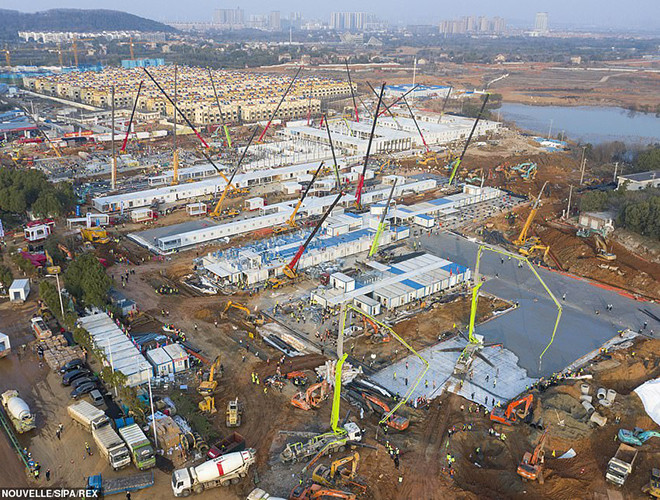 ANTD.VN - Theo mô hình điều trị dịch SARS của Bắc Kinh 17 năm trước, thành phố Vũ Hán ở tỉnh Hồ Bắc đang xây dựng 2 bệnh viện Lôi Thần Sơn và Hỏa Thần Sơn trong khi số người nhiễm virus corona mới là 9.692 người, với 212 ca tử vong (số liệu cập nhật trưa 31-1). Hoạt động ngày đêm cho kịp tiến độ, 2 cơ sở dự kiến sẽ được đưa vào sử dụng vào ngày 3 và ngày 5-2, hoàn thành với tốc độ thần tốc chỉ trong 10-12 ngày, cung cấp khoảng 2.600 giường bệnh mới.
