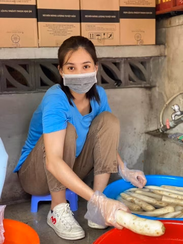 Tuy bận rộn song Tiểu Vy tâm sự, với cô thì đây thật sự là những ngày ý nghĩa vô cùng. Bởi giữa thời điểm dịch bệnh diễn biến phức tạp, số ca mắc Covid-19 vẫn gia tăng tại TP.HCM thì cô đã có thể góp sức mình vào một công việc ý nghĩa, đó là tham gia nấu những suất cơm của bếp ăn từ thiện. Những suất ăn này sau đó sẽ được gửi đến hỗ trợ cho các đơn vị đang làm nhiệm vụ truy vết F0, F1, những địa điểm đang thực hiện lệnh phong tỏa, cách ly tập trung và hỗ trợ lực lượng dân quân tự vệ trên địa bàn thành phố.