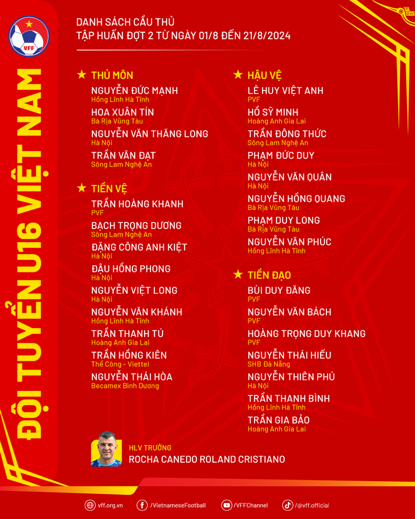 Để chuẩn bị cho Vòng loại U17 châu Á 2025, HLV Cristiano đã chấm chọn danh sách tập trung đội tuyển U16 Việt Nam gồm 28 cầu thủ, trong đó một nửa là các gương mặt đã qua “thử lửa” tại giải Đông Nam Á vừa qua, bên cạnh những bổ sung chất lượng từ giải U17 quốc gia.