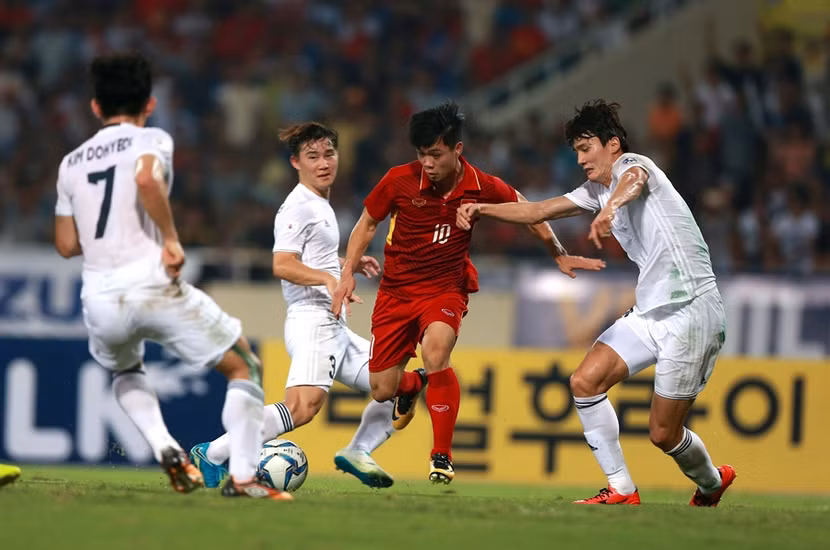 Công Phượng giữa vòng vây của cầu thủ Các ngôi sao K-League (Ảnh: Vũ Vy)