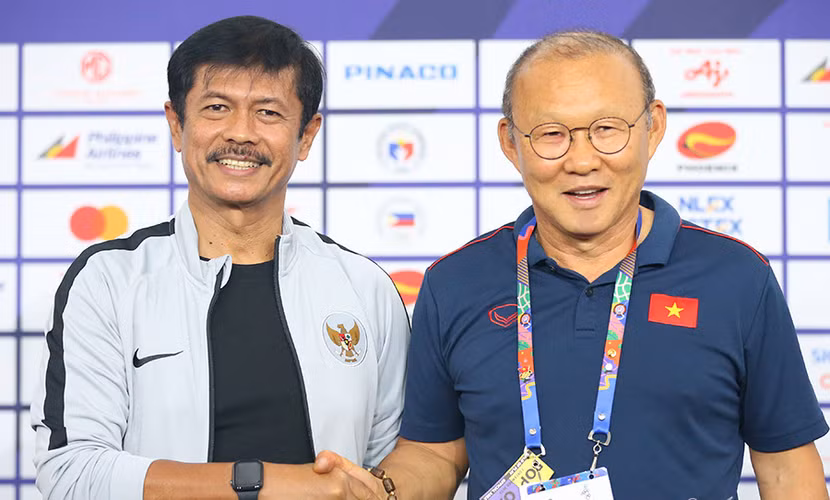 HLV Park Hang-seo (phải) bắt tay HLV Indra Sjafri tại họp báo trước trận chung kết
