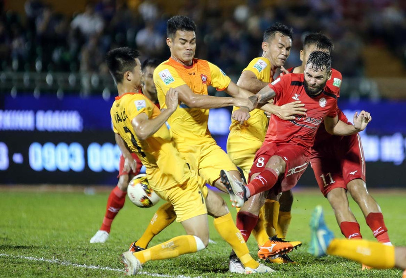 CLB TP.HCM (áo đỏ) gặp khó khi lực lượng tổn thất nặng nề