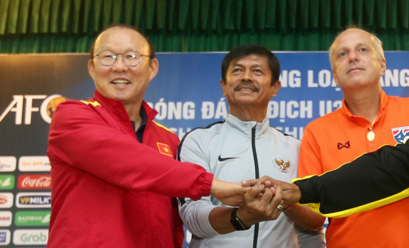 Từ trái qua: HLV Park Hang-seo cùng HLV Sjafri của Indonesia và Gama của Thái Lan