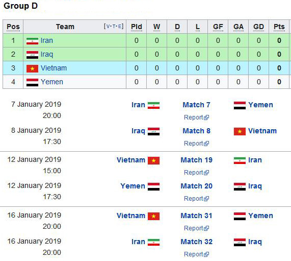 Trên bảng xếp hạng FIFA, Iran là đội bóng có thứ hạng cao nhất châu Á - vị trí 29. Thầy trò HLV Queiroz được quy hoạch vào nhóm ứng viên vô địch Asian Cup 2019. Trong khi đó, Iraq (hạng 88) và Việt Nam (hạng 100) dự báo cạnh tranh ngôi nhì bảng. Yemen (hạng 135) bị đánh giá yếu nhất bảng D.