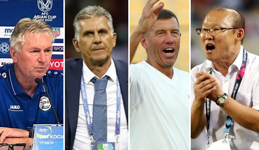 Từ phải qua: HLV Park Hang-seo (Việt Nam), Srecko Katanec (Iraq), Carlos Queiroz (Iran) và Jan Kocian (Yemen)