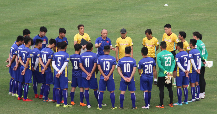 Các thành viên đội tuyển tiếp thu ý kiến của HLV Park Hang-seo (ảnh Bảo Lâm)