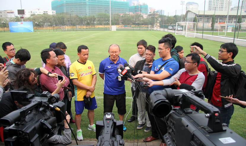 HLV Park Hang-seo trả lời truyền thông trước buổi tập (ảnh Bảo Lâm)