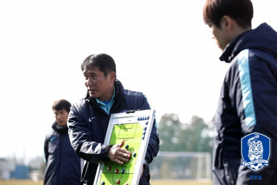 HLV Kim Bong Gil chỉ đạo học trò trong một buổi tập chuẩn bị VCK châu Á