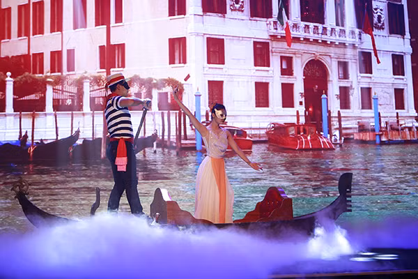 Mở màn sự kiện, hàng trăm nhà đầu tư cùng ngỡ ngàng khi một Venice xinh đẹp lãng mạn được tái hiện ngay trước mắt. Xuất hiện giữa khung cảnh sang trọng của khán phòng khách sạn 5 sao là chiếc thuyền Gondola huyền thoại, cùng người chèo thuyền vận trang phục đặc trưng: áo kẻ ngang đen trắng, quần đen, đội mũ và đang chở khách trên dòng kênh thơ mộng. Hai bên là những ngôi nhà cổ kính nhiều màu sắc với khung cửa sổ rực rỡ sắc hoa.