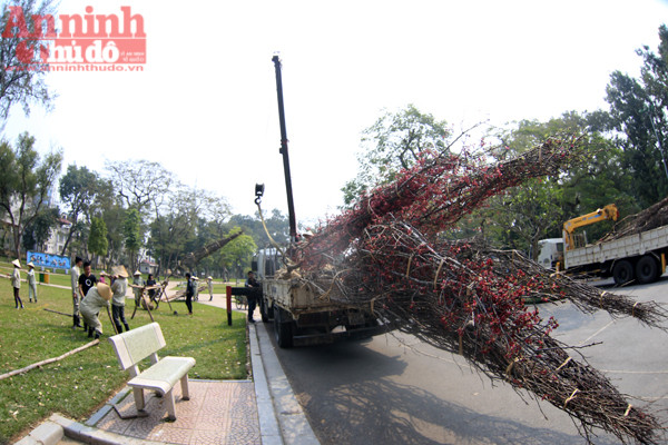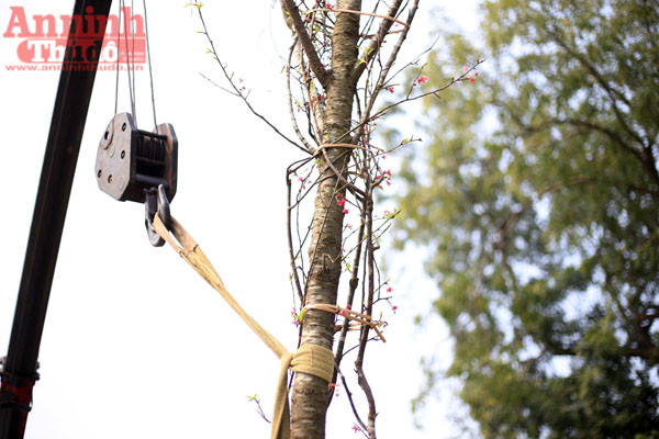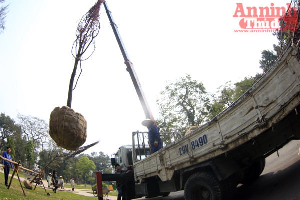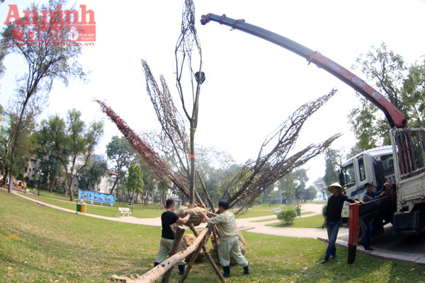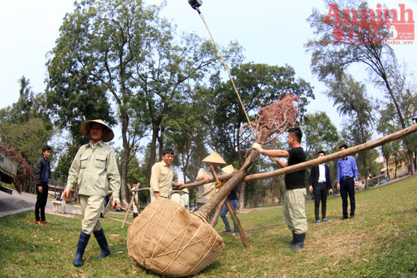 Sau khi được cẩu xuống, những cây hoa anh đào này được để tạm thời như thế này. Trong ngày mai, các chuyên gia của Nhật Bản sẽ đích thân đến để chăm sóc...