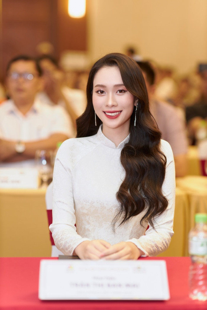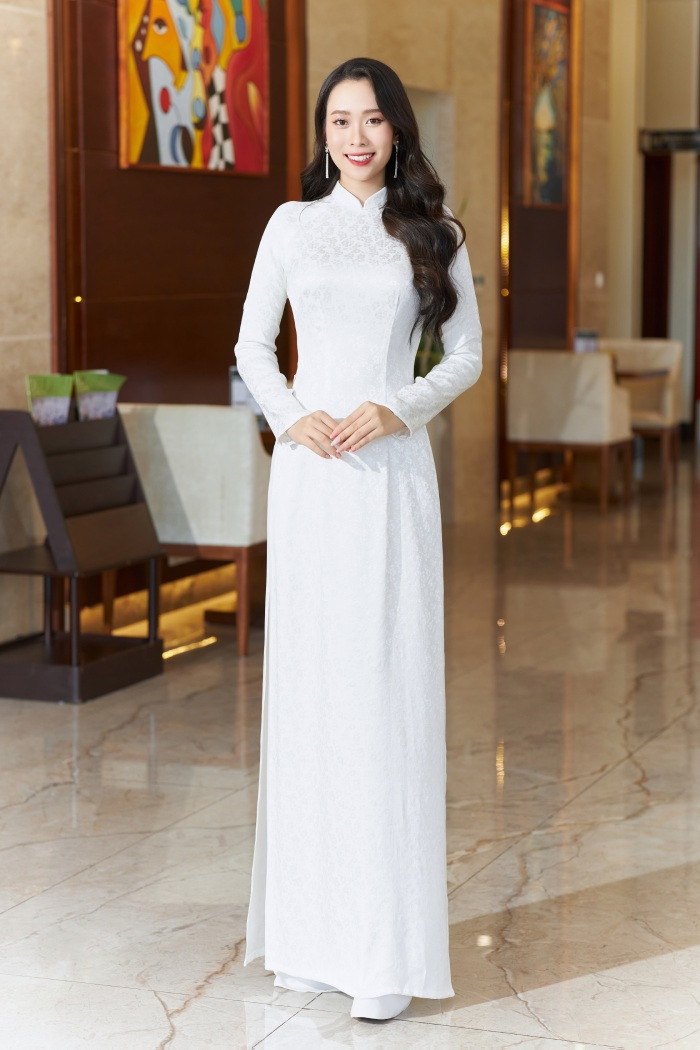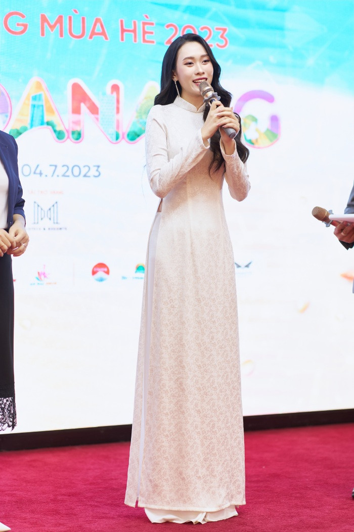 Xuất hiện tại sự kiện họp báo lớn của thành phố Đà Nẵng, hoa hậu Ban Mai chọn chiếc áo dài gấm trắng nhã nhặn của nhà thiết kế Thuận Việt, cô trang điểm nhẹ nhàng, thanh lịch.