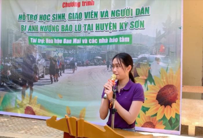 Hoa hậu Ban Mai bày tỏ cô vô cùng xót xa trước tin tức thời sự trên báo, đài và mạng xã hội về thiên tai, những mất mát của người dân ở vùng bão lũ Kỳ Sơn. Vì vậy thay vì chỉ ủng hộ bằng vật chất, Ban Mai đã trực tiếp đến tận nơi thăm hỏi, động viên bà con ở huyện Kỳ Sơn khi điều kiện đi lại cho phép.