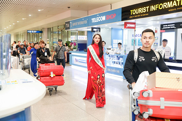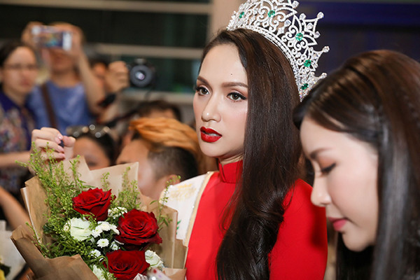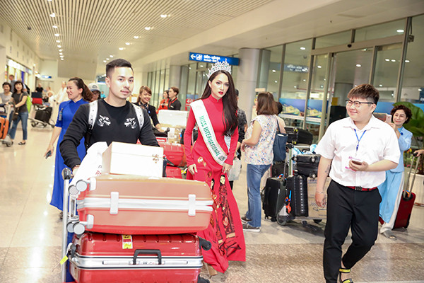 Mới đây, ngay sau khi đáp chuyến bay về Việt Nam, Hương Giang gây chú ý khi diện áo dài truyền thống và mang 7 chiếc vali chứa đựng hàng chục kg hành lý. Nữ ca sĩ bị bao vây bởi hàng trăm fans hâm mộ có mặt tại sân bay Tân Sơn Nhất từ trưa để chào đón và bày tỏ sự ngưỡng mộ trước những nỗ lực của tân Hoa hậu. Cô còn nhận được hoa và những món quà hand-made do các fans tặng.