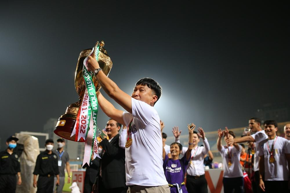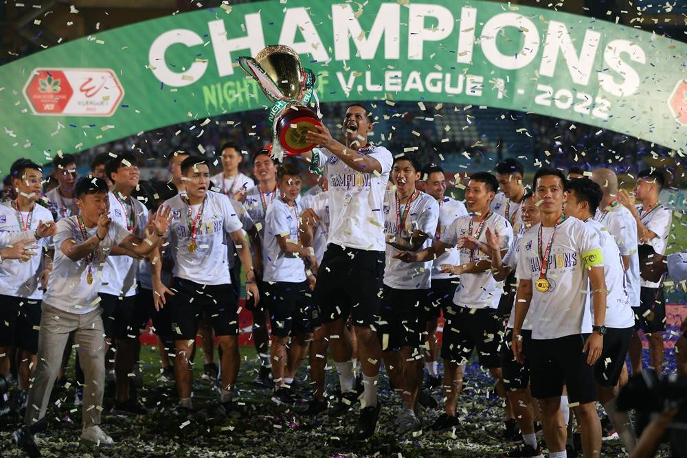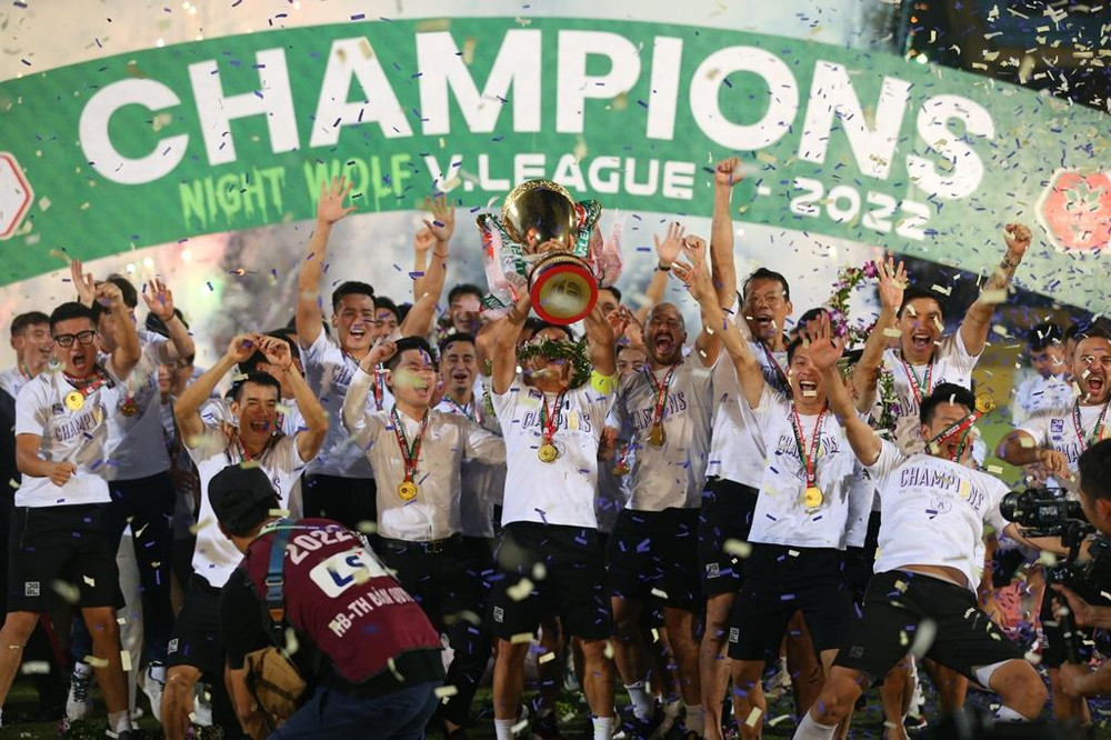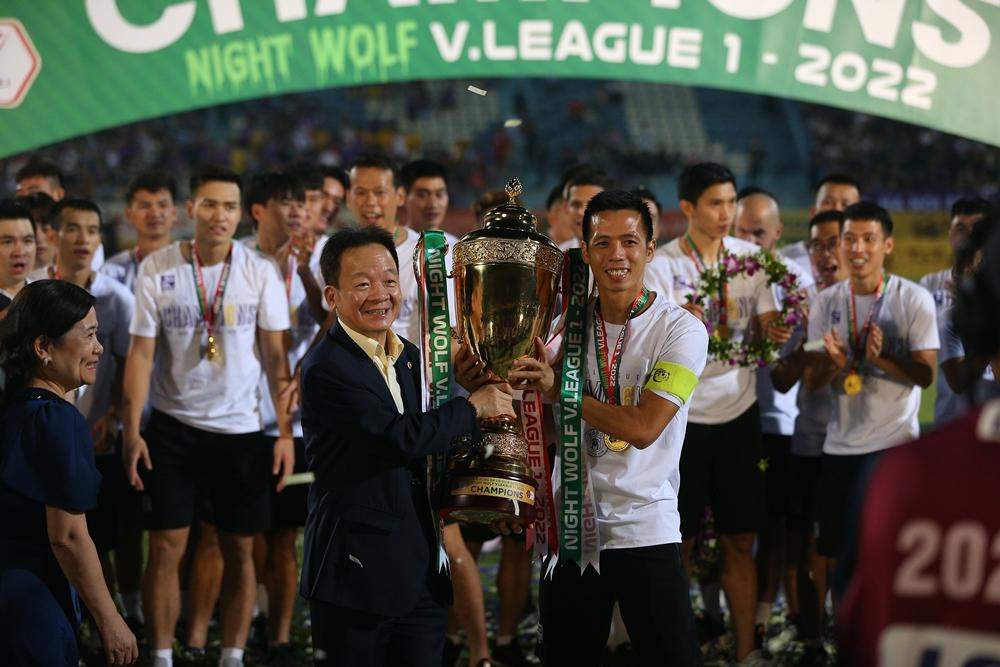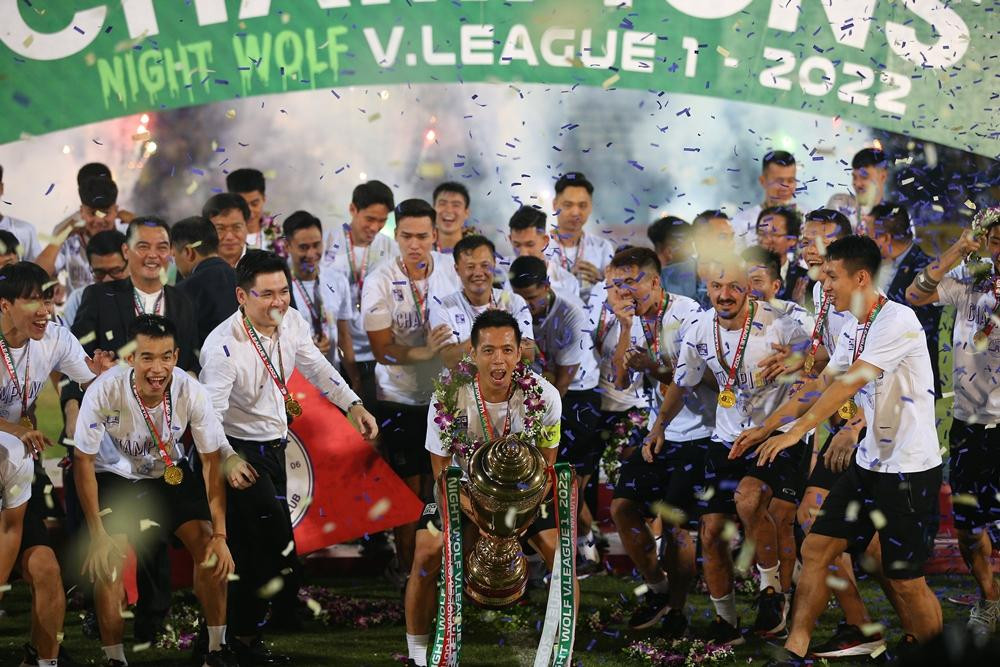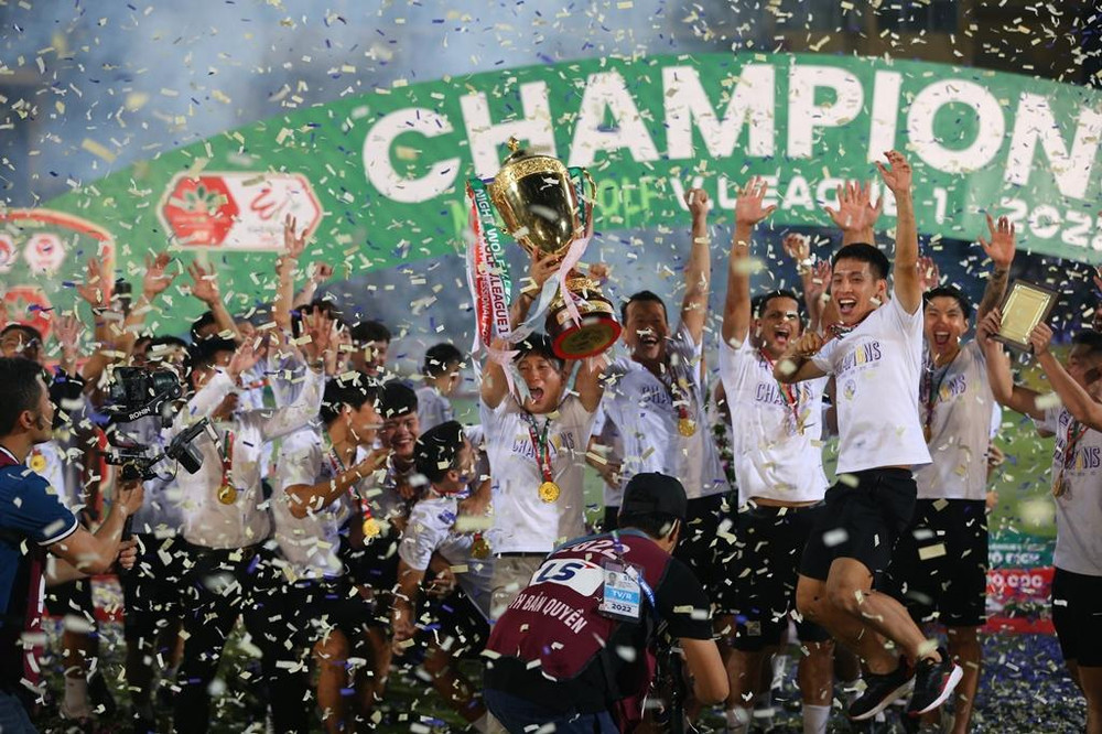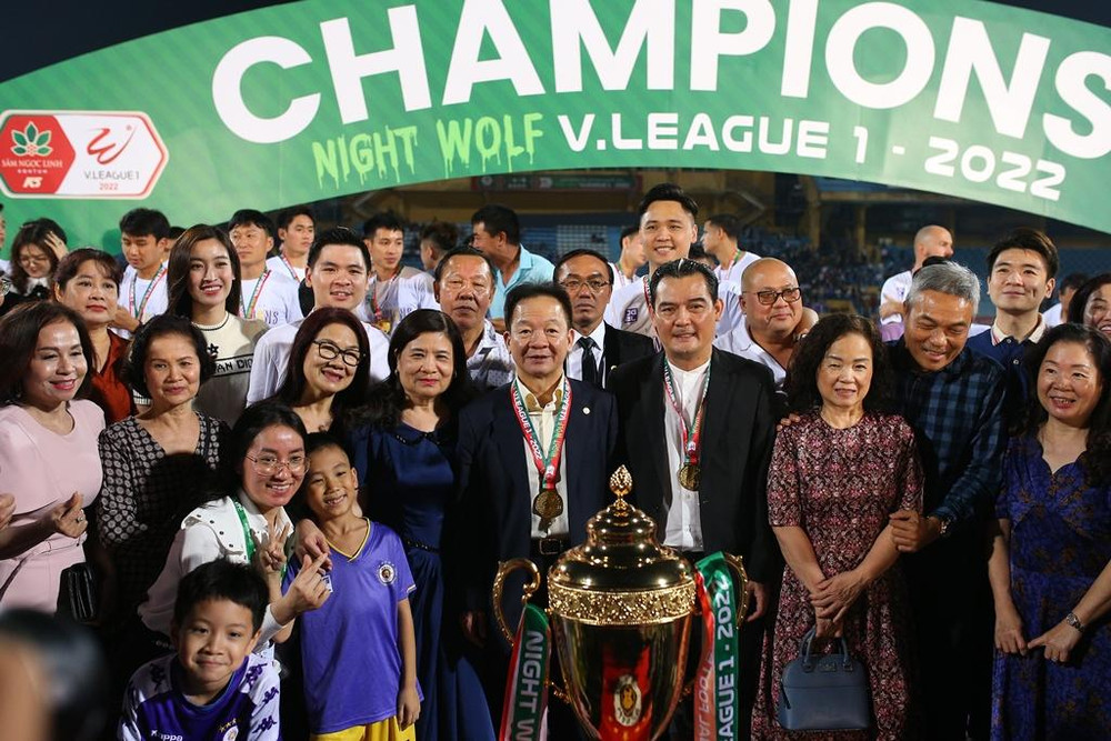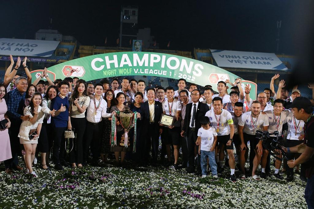 ANTD.VN - Hoa hậu Đỗ Mỹ Linh - vợ chủ tịch CLB Hà Nội Đỗ Vinh Quang tươi rói xuống sân ăn mừng, nâng cúp vô địch V-League 2022 cùng đội bóng Thủ đô.