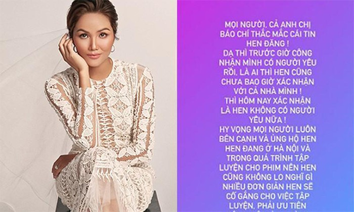 Không còn là tin đồn khi mới đây thông qua trang mạng xã hội Instagram, H’hen Niê chia sẻ dòng trạng thái xác nhận “Hen không có người yêu nữa”. Người đẹp gốc Ê đê giãi bày, trước giờ cô công khai việc mình đã có bạn trai, tuy nhiên người đó là ai thì cô chưa bao giờ tiết lộ. Chỉ có điều đến thời điểm này, cô và người yêu đã chính thức “đường ai nấy đi”.
