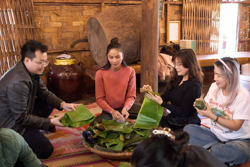 Tuy cực nhưng H’Hen Niê rất vui: “Đây là những đòn bánh tét chứa đựng tình cảm chân thành của mọi người gửi đến bà con. Mỗi người một tay một công đoạn, không khí đông vui và mùi bánh thơm nồng làm Hen thấy hạnh phúc vô cùng”.