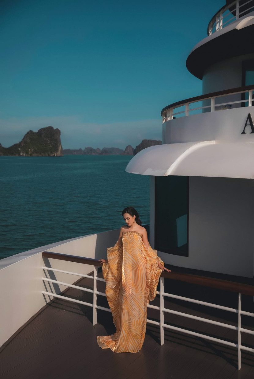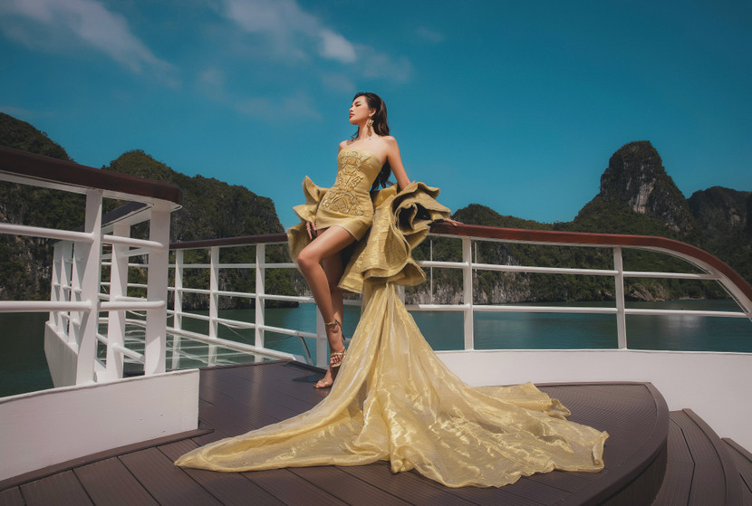Trong vai trò "nàng thơ" của dự án, Lê Hoàng Phương khoác lên mình những thiết kế tinh xảo từ bộ sưu tập “Golden Heritage” của nhà thiết kế Lê Thanh Hòa. Bộ ảnh được cô thực hiện trên du thuyền giữa Vịnh Hạ Long, kỳ quan thiên nhiên thế giới, tạo nên sự kết hợp độc đáo giữa thời trang cao cấp và cảnh sắc thiên nhiên hùng vĩ.