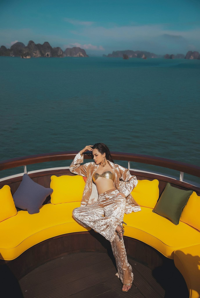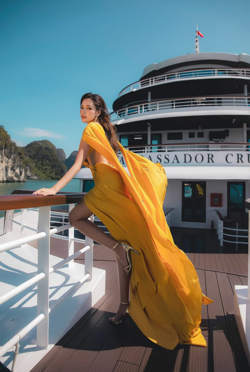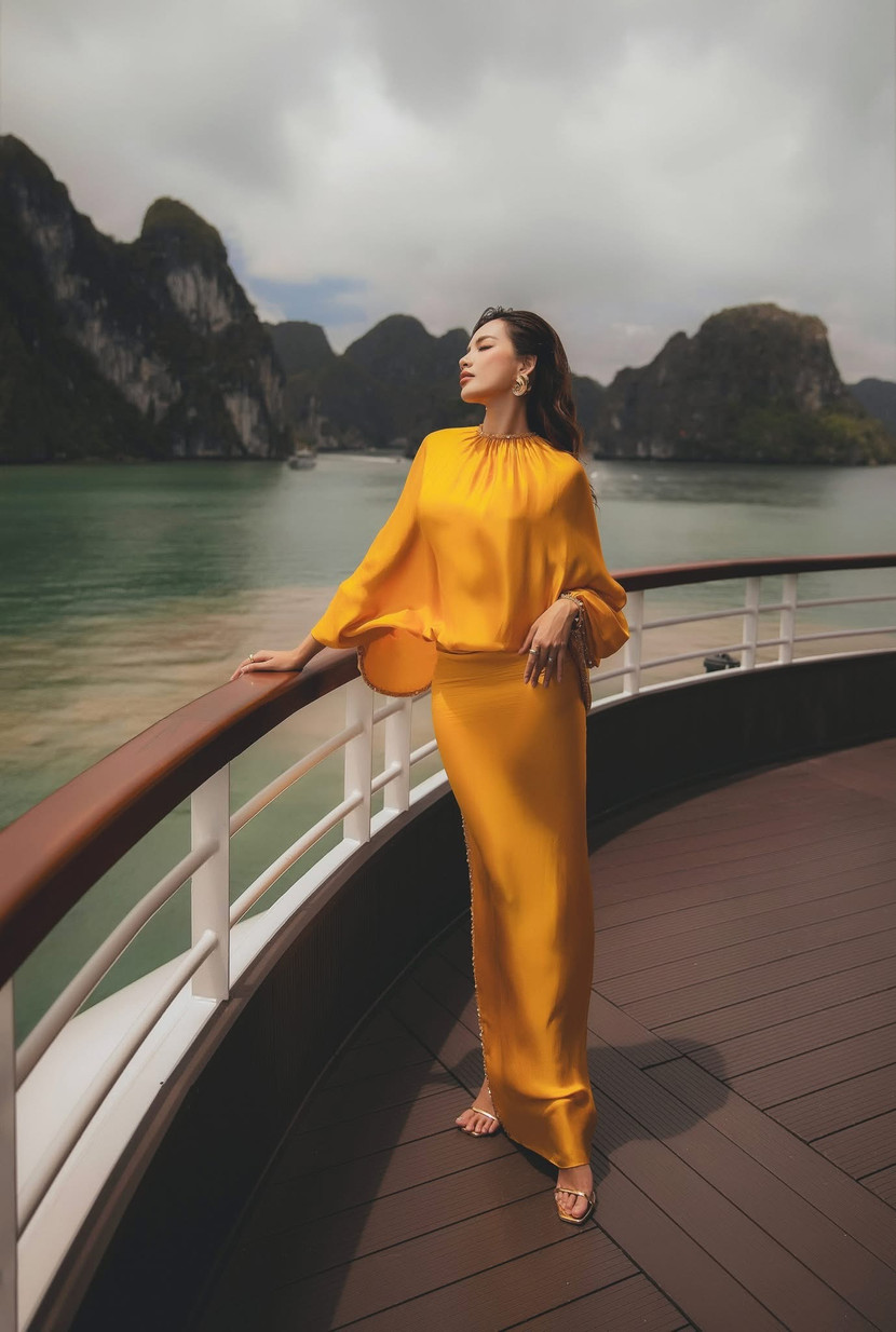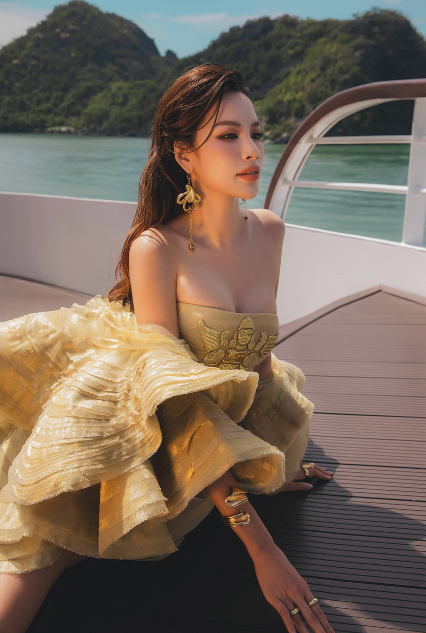 Trong từng khung hình, Lê Hoàng Phương thể hiện trọn vẹn tinh thần của bộ sưu tập "Golden Heritage" – sang trọng, quyền lực và đầy tính biểu tượng. Là một trong những hoa hậu sở hữu vóc dáng ấn tượng của showbiz Việt hiện nay, cô tận dụng triệt để hình thể chuẩn quốc tế cùng thần thái tự tin để tôn vinh những đường cắt xẻ táo bạo. Đặc biệt, ánh mắt sắc lạnh, lối tạo dáng dứt khoát và chuyển động mềm mại trước ống kính giúp cô trở thành tâm điểm giữa khung cảnh thiên nhiên hùng vĩ của Vịnh Hạ Long.