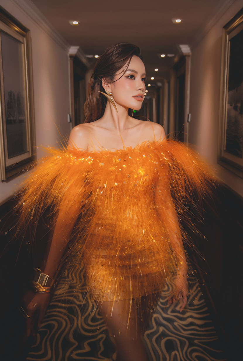 Xuất hiện trong các thiết kế của bô sưu tập, Lê Hoàng Phương thể hiện hình ảnh người phụ nữ Việt Nam thanh lịch, thời thượng nhưng vẫn giữ trọn bản sắc văn hóa. Nàng hậu khai thác lợi thế hình thể với đầm ngắn ôm sát, thiết kế cắt xẻ tinh tế, làm nổi bật đôi chân thon dài, kết hợp cùng trang sức ánh kim hài hòa, tạo nên tổng thể quyến rũ và sang trọng.