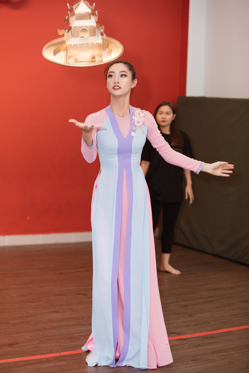 Để chuẩn bị cho tiết mục này, đại diện Việt Nam - Hoa hậu Lương Thùy Linh đã tập luyện điệu múa mâm vàng và sẵn sàng thể hiện trên sân khấu.