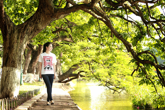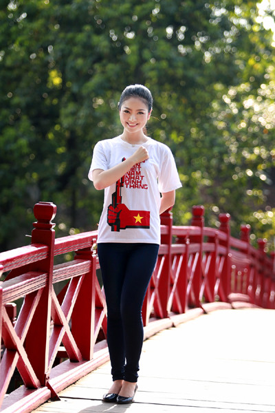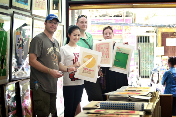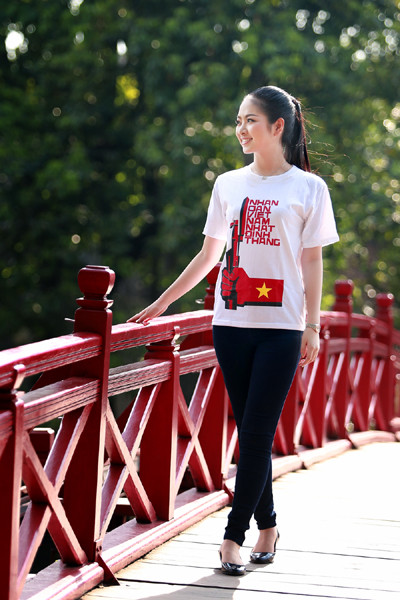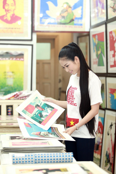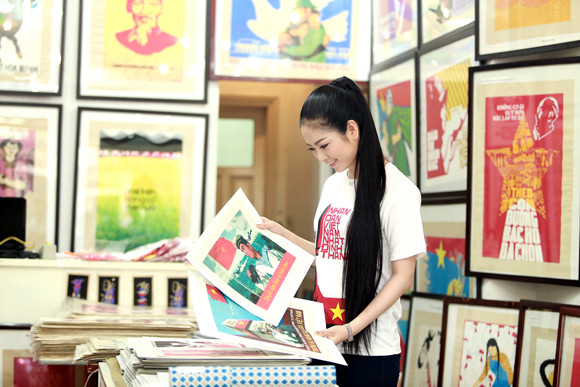 Không chỉ mặc áo in tranh cổ động, Hoa hậu Nguyễn Ngọc Anh đã dành một buổi chiều để tìm hiểu về lịch sử đấu tranh giữ nước của Việt Nam thông qua những bức tranh cổ động được bày bán ở phòng tranh trên phố cổ Hàng Bạc. Hoa hậu Ngọc Anh cho biết, bản thân cô đã gắn bó với những bức tranh cổ động từ hồi còn ấu thơ.