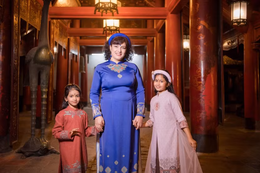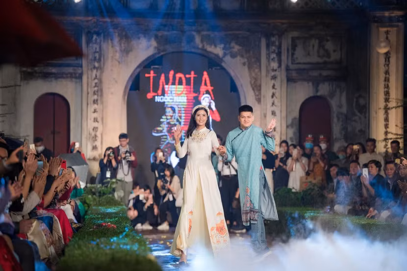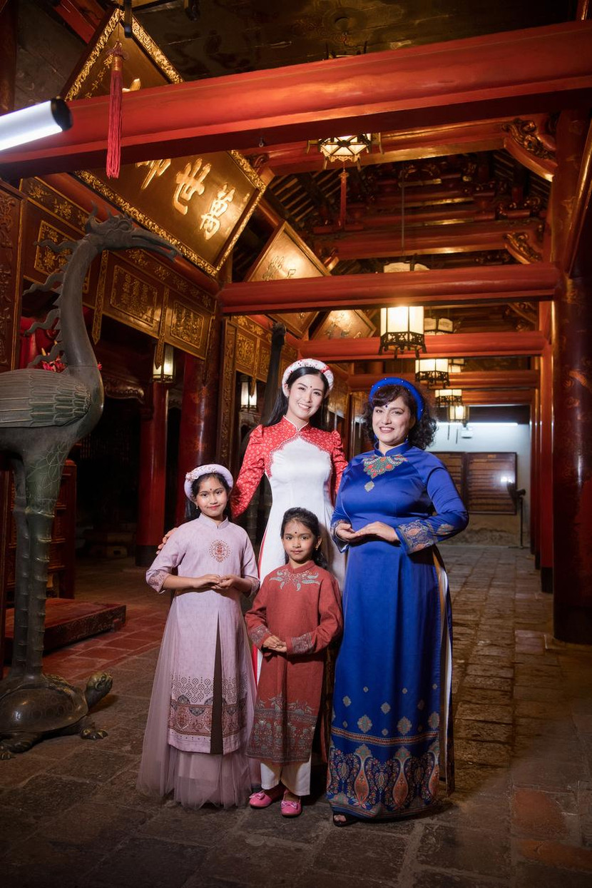 Nói về bộ sưu tập lần này, cựu “Hoa hậu Việt Nam” tiết lộ, các mẫu thiết kế được cô lấy cảm hứng từ đất nước Ấn Độ, quốc gia cô từng có dịp ghé thăm và tham gia một số sự kiện văn hoá tại đây. Theo đó, người đẹp đã sáng tạo nên những mẫu áo dài “tông xoẹt tông” về màu sắc, kiểu dáng dành cho mẹ và bé mang tính ứng dụng cao. Vẫn là phom dáng quen thuộc của áo dài Việt nhưng Ngọc Hân khéo léo đưa những hoạ tiết văn hoá đặc trưng của Ấn Độ lên áo thông qua chi tiết thêu thủ công hoặc tách đôi tà áo dài phía trước – điểm nhấn quen thuộc trên trang phục của nam giới Ấn Độ. Cô sử dụng những màu sắc đa dạng từ tông lạnh đến tông nóng để bộ sưu tập thêm phần ấn tượng.