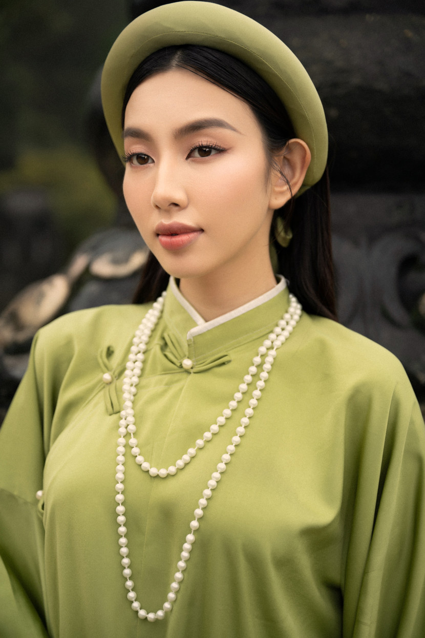 Tại đây, Thùy Tiên chọn mặc áo tấc - bộ lễ phục trang trọng, kín đáo, mang nhiều ý nghĩa nhân văn, tôn vinh vẻ đẹp của người phụ nữ Việt Nam. Trong bộ áo tấc màu xanh, chân đi guốc mộc, người đẹp xuất hiện với phong thái nhẹ nhàng và nét đẹp dịu dàng của người phụ nữ truyền thống xưa. Thùy Tiên tâm sự, dù từng nhiều lần khoác lên mình trang phục truyền thống Việt Nam song cô vẫn không khỏi xúc động khi tái hiện lại hình ảnh cổ phục xưa.
