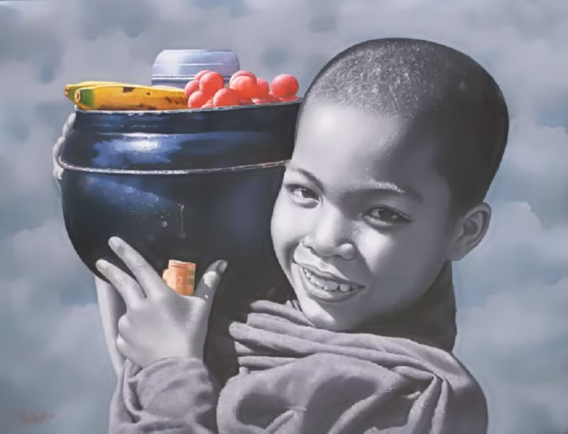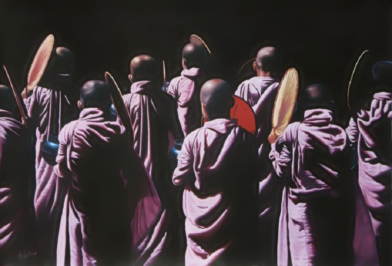 Trong tranh Aung Kyaw Htet, người xem dễ bắt gặp hình ảnh các nhà sư, chú tiểu, những người hành hương... Đây là những nhân vật luôn được họa sĩ chăm chút, nâng niu, cẩn trọng với từng nét cọ.
