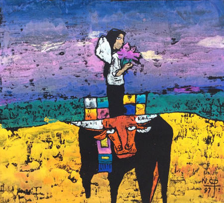 Các tác phẩm hội họa của họa sỹ Nguyễn Văn Cường tựa như những khúc đồng dao có sức hút kỳ lạ. Ở đó, ký ức tuổi thơ bao giờ cũng được khoác chiếc áo đủ sắc màu với bố cục có tính ước lệ, dù không gian của nó là cánh đồng, sân nhà, ngõ xóm hay con đường. Đặc biệt, hình ảnh về con trâu được lặp đi lặp lại trong hầu hết các tác phẩm của ông.