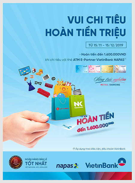 Để hỗ trợ cho khách hàng khi chi tiêu, VietinBank triển khai chương trình khuyến mãi “Vui chi tiêu - Hoàn tiền triệu” từ ngày 15/11/2019 đến hết ngày 15/12/2019 cho chủ thẻ VietinBank E-Partner Napas. Chương trình mang tới ưu đãi hoàn tiền đến 1,6 triệu đồng cho chủ thẻ.