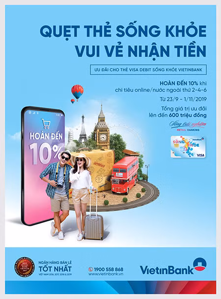 Dù là tín đồ mua online hay có sở thích du lịch khám phá, chắc chắn quý KH không thể bỏ qua những cơ hội ưu đãi đặc biệt mà VietinBank mang đến cho các chủ thẻ Visa debit Sống khỏe. Theo đó từ ngày 23/9/2019 đến 1/11/2019, VietinBank dành tặng chủ thẻ GNQT Visa Sống khỏe CTKM: “Quẹt thẻ Sống khỏe - Vui vẻ nhận tiền” với tổng số tiền ưu đãi cho KH lên đến 600 triệu đồng. Cụ thể: