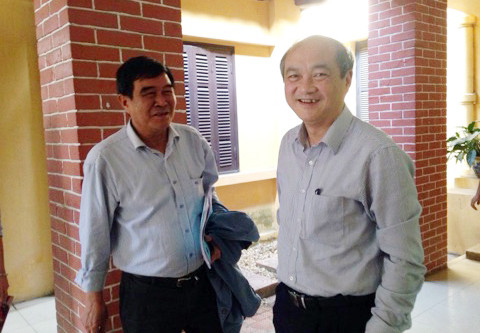 Tổng cục trưởng Tổng cục TDTT Vương Bích Thắng (phải) và Phó Chủ tịch VFF Nguyễn Xuân Gụ bên hành lang cuộc họp chiều 18-4 (Ảnh: Bảo Lâm)