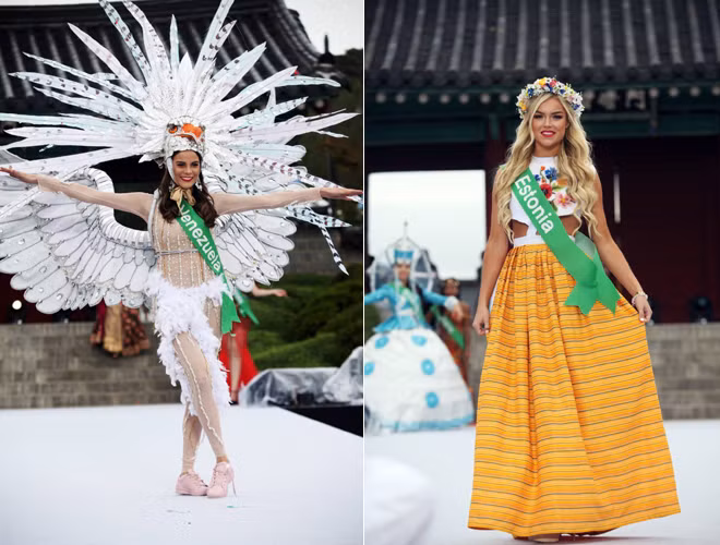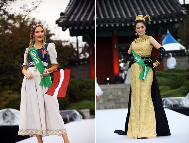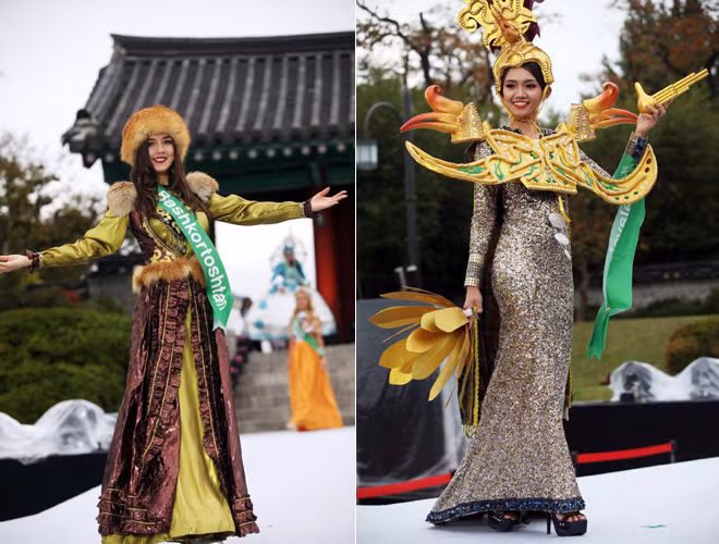 Hoàng Thu Thảo diện áo dài cách điệu, nổi bật giữa dàn trang phục dân tộc thế giới
