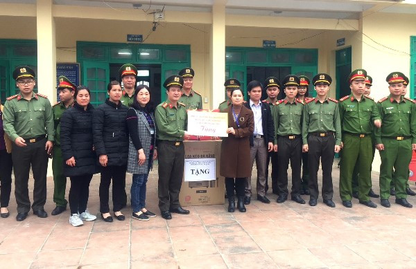 Đại diện Ban chỉ huy và CBCS - CAQ Hoàn Kiếm tặng quà Trường tiểu học Đàm Thủy