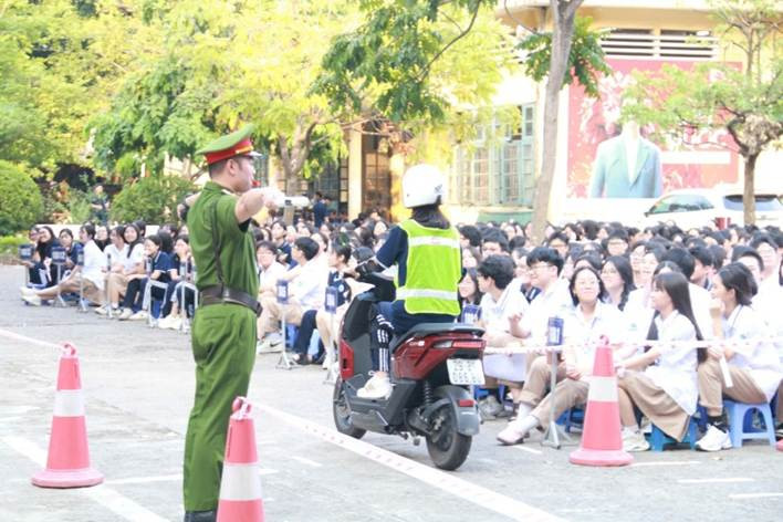 Cũng tại buổi tuyên truyền, báo cáo viên đã giới thiệu các động tác điều khiển giao thông cơ bản, cho học sinh thực hành. Việc tuyên truyền, phổ biến kết hợp các câu hỏi trắc nghiệm, phát quà khiến không khí học hỏi của học sinh vô cùng tích cực.