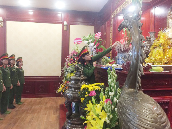 Trung tá Trần Thị Thanh Thủy, Chủ tịch Hội phụ nữ CAQ Long Biên, đơn vị Cụm trưởng Cụm thi đua số 6 dâng hương tưởng nhớ Bác Hồ
