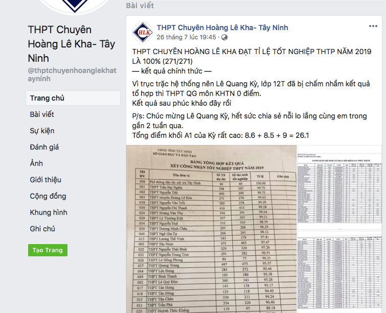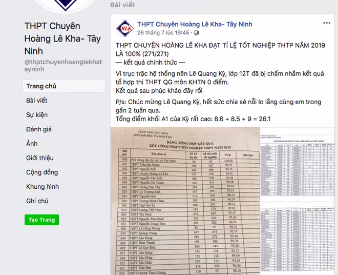 Ngay khi có kết quả phúc khảo, trên trang Fanpage của trường THPT Chuyên Hoàng Lê Kha công bố thông tin "THPT Chuyên Hoàng Lê Kha đạt tỷ lệ tốt nghiệp năm 2019 là 100% (271/271) và đặc biệt nhấn mạnh: “Vì trục trặc hệ thống nên Lê Quang Kỳ, lớp 12T đã bị chấm nhầm kết quả tổ hợp thi THPT quốc gia môn KHTN 0 điểm. Kết quả sau phúc khảo đây rồi. Chúc mừng Lê Quang Kỳ, hết sức chia sẻ nỗi lo lắng cùng em trong gần 2 tuần qua. Tổng điểm khối A1 của Kỳ rất cao: 8.6 + 8.5 + 9 = 26,1”