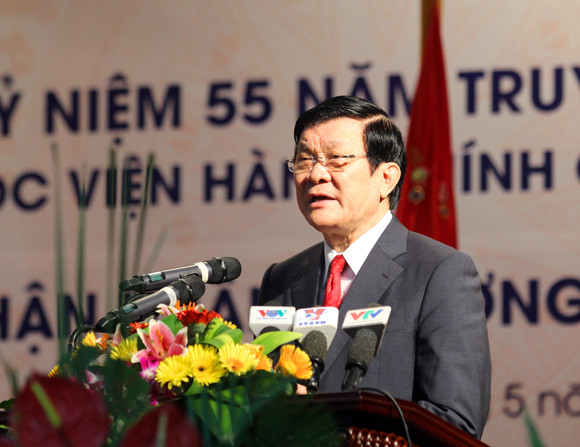 Phát biểu tại buổi lễ, Chủ tịch nước Trương Tấn Sang đã ghi nhận và biểu dương những nỗ lực, cố gắng mà tập thể cán bộ, giảng viên, sinh viên Học viện Hành chính Quốc gia đã đạt được trong 55 năm qua. Chủ tịch nước nhấn mạnh một số nhiệm vụ học viện cần tiếp tục thực hiện trong thời gian tới, như tập trung đổi mới nâng cao nội dung, chương trình, phương pháp dạy và học, bồi dưỡng cán bộ công chức một cách toàn diện.