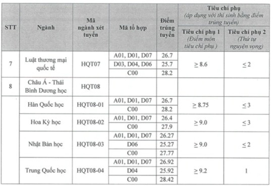 Điểm chuẩn thấp nhất trường là ngành luật thương mại quốc tế ở khối D03, D04, D06 với 25,7 điểm.