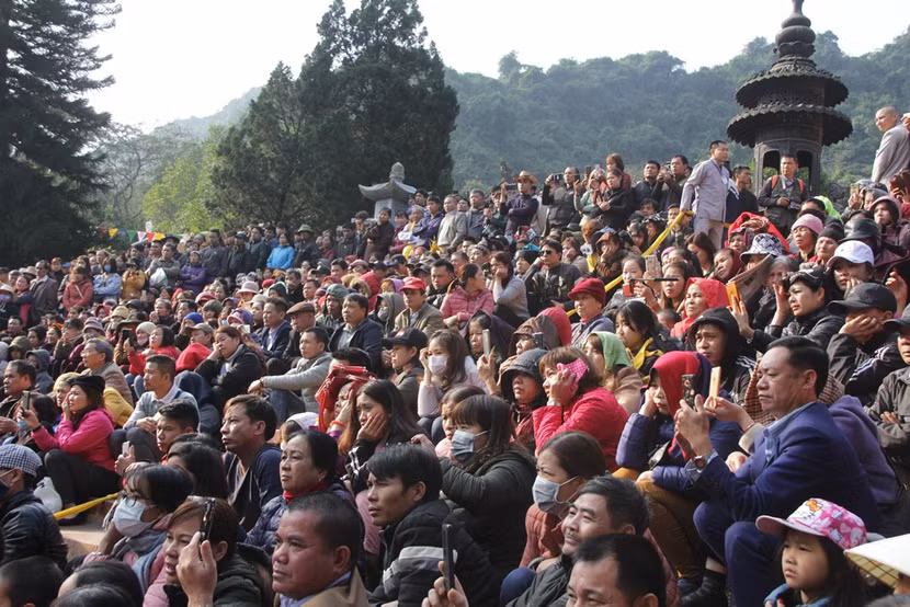 Đông đảo người dân tụ hội về sân chùa Thiên Trù để chứng kiến nghi lễ khai hội chùa Hương